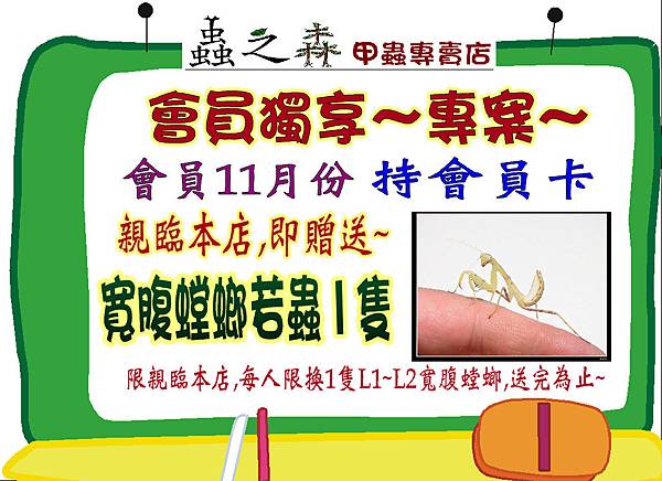 限親臨本店,每人限換1隻L1~L2寬腹螳螂,送完為止~