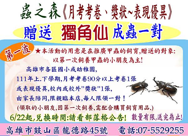 1.本活動的用意是在推廣甲蟲的飼育,贈送的對象以第一次飼養甲蟲的小朋友為主!